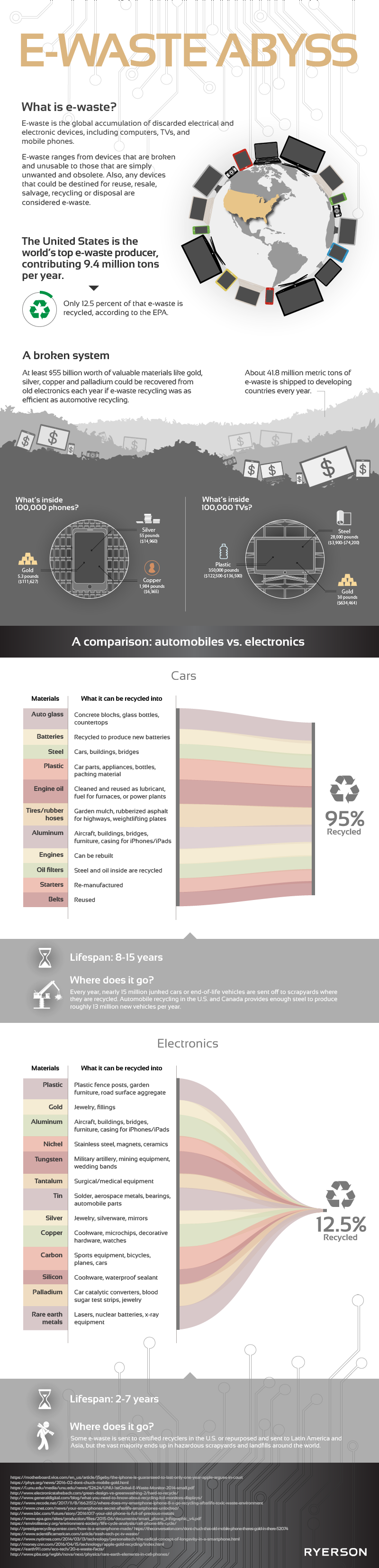 Para tener una idea más clara de lo que esto significa, piense en 100,000 smartphones. Dentro de estos computadores de mano se encuentra el equivalente a 55 libras de plata, 5.3 libras de oro y 1.984 libras de cobre - de lo cual todo constituye materiales reciclables y de alta demanda. Desafortunadamente, de acuerdo con la EPA (Agencia de Protección Ambiental, por sus siglas en inglés), únicamente se recicla el 12.5 por ciento de los desechos-e.